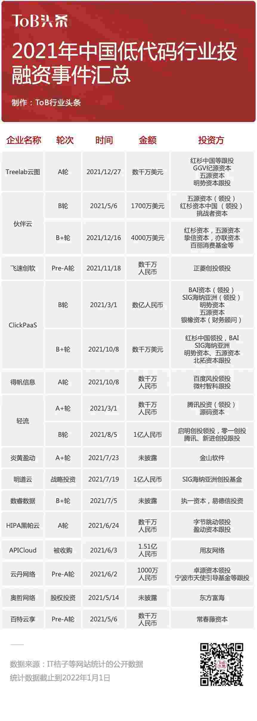 到2021年,,,无/低代码投融资规模势头更甚,,其中包括轻流两轮融资(A+轮数千万人民币,,,B轮近亿人民币)、、沃钱包 两轮融资(B轮数亿人民币,,,,B+轮数千万美元)、、、、百特云享数千万元Pre-A轮融资......