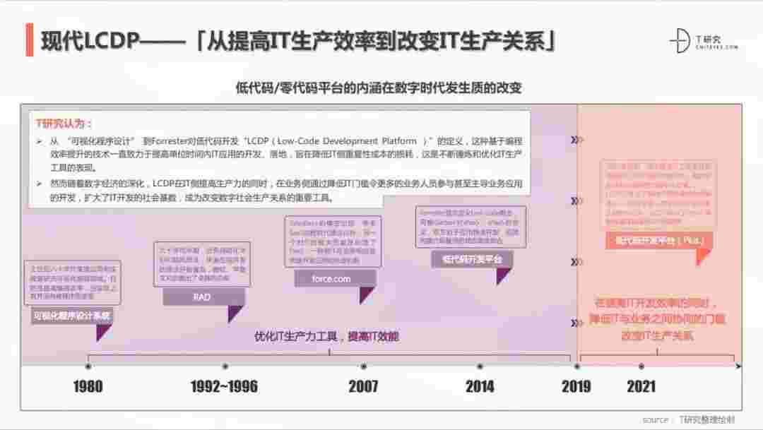 2020年前后,,,,源于提高IT工作者开发效能的LCDP不断进化和衍生,,,,面对业务导向日益明显的数字化变革。。。。LCDP衍生出了面向不同对象的升级服务——面向专业人群的LCDP和业务人群的NCDP,,LCDP与NCDP的不同服务属性被逐渐认可和接受。。。。 LCDP在提高IT开发效率的同时,,,,降低IT与业务之间协同的门槛改变IT生产关系。。。。