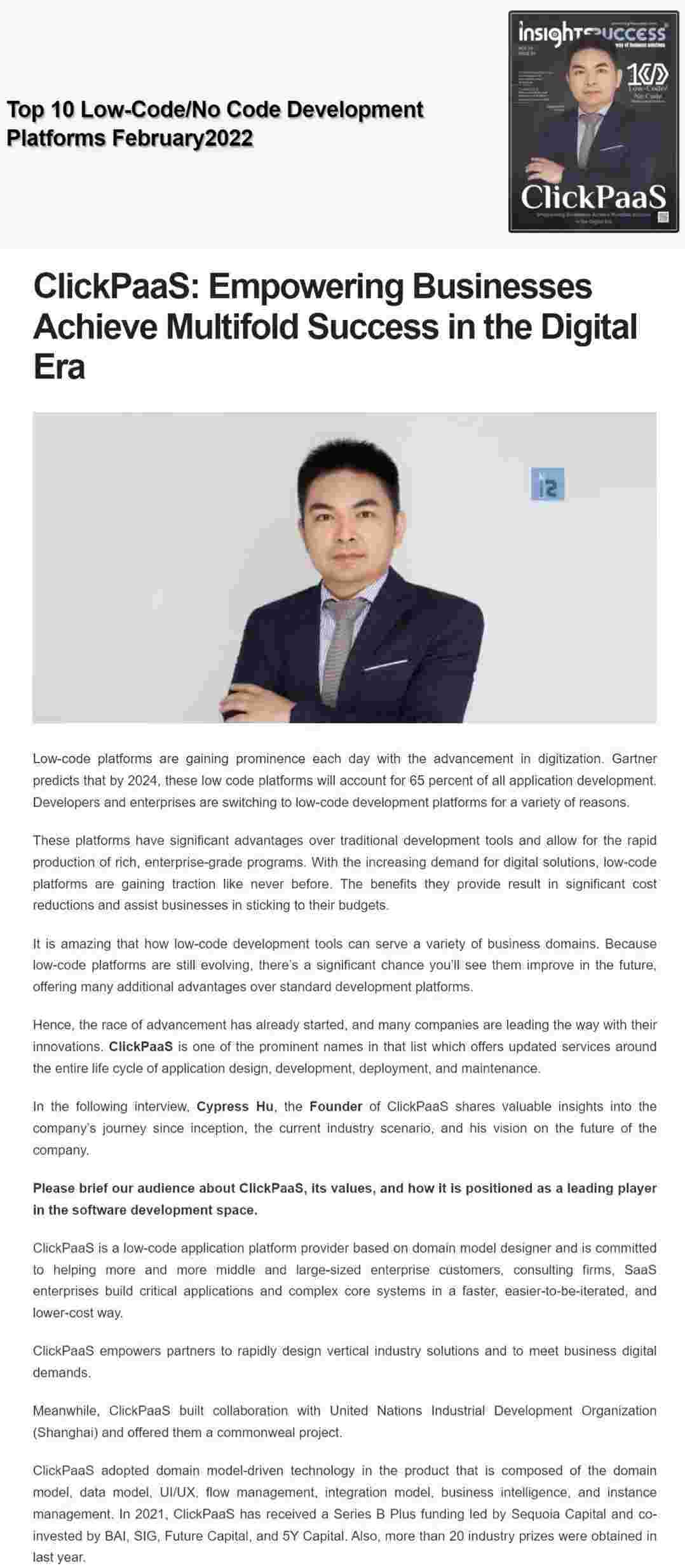 2022年年初,,,沃钱包入选外媒Insights Success低代码/无代码开发平台 Top10,,,创始人、、、、CEO胡柏受邀接受专访并荣登封面人物,,,他与Insights Success的读者分享了沃钱包成立的初心、、、发展历程、、、当前的行业发展趋势以及他对公司未来的展望。。。。
